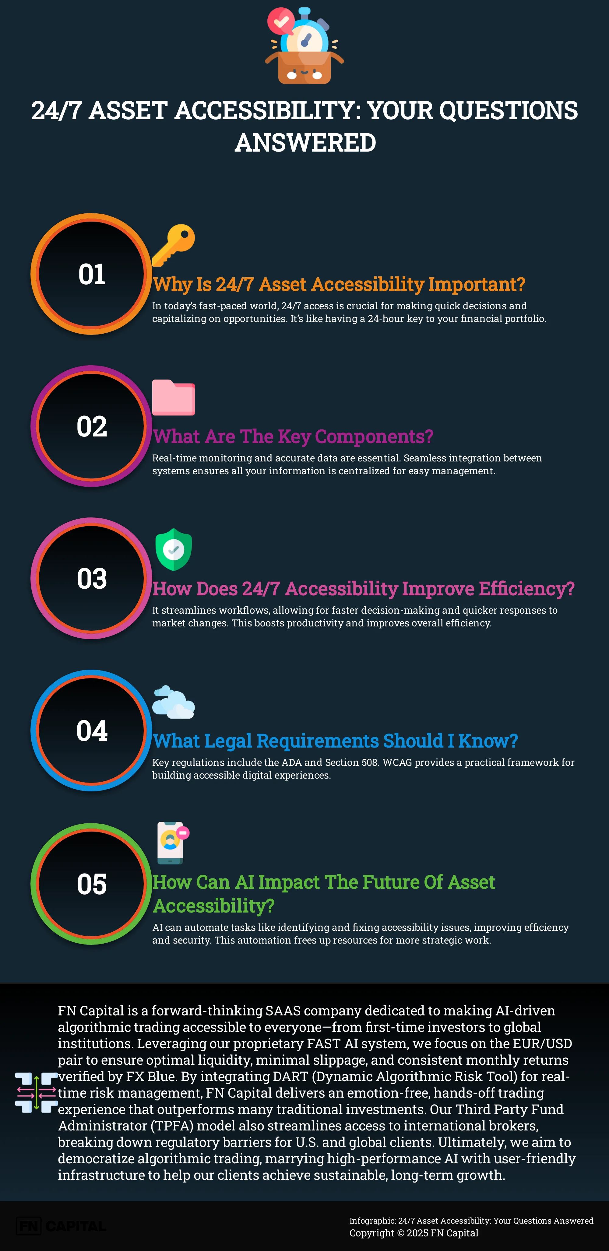 In today’s interconnected world, instant access to information and resources is no longer a luxury—it’s an expectation. Whether you’re managing investments, tracking inventory, or ensuring your website reaches the widest possible audience, 24/7 asset accessibility has become mission-critical. This constant availability empowers you to react swiftly to market changes, optimize resource allocation, and create a seamless user experience for everyone. This article explores the key components of 24/7 asset accessibility, its benefits, and how to implement it effectively in your organization. We’ll also examine the legal landscape of digital accessibility and discuss the future of this rapidly evolving field.